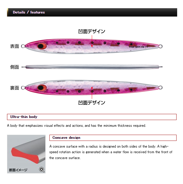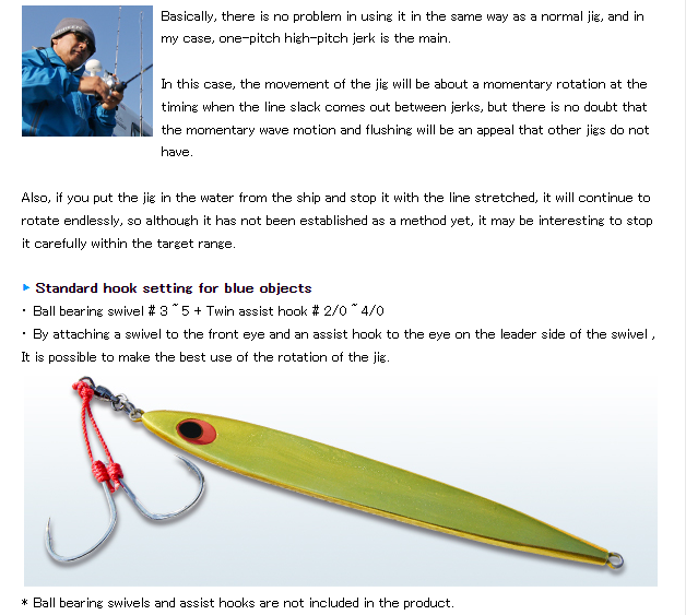 Designed by Yoshitaka Tsurusaki. A true spin jig adds a powerful personality of “rotation” to a thin jig that is extremely effective for blue-backed fish such as amberjack and yellowtail.