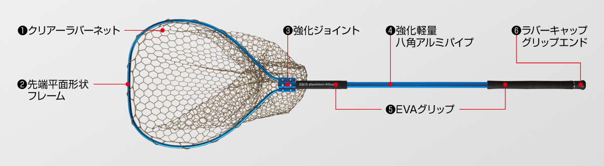 Golden Mean Ocean Net Jr. uses a reinforced lightweight aluminum shaft / reinforced aluminum frame for handling as well as reinforced original parts for joints to support big fish. The deep rubber net greatly improves the catch rate without damaging the fish.
