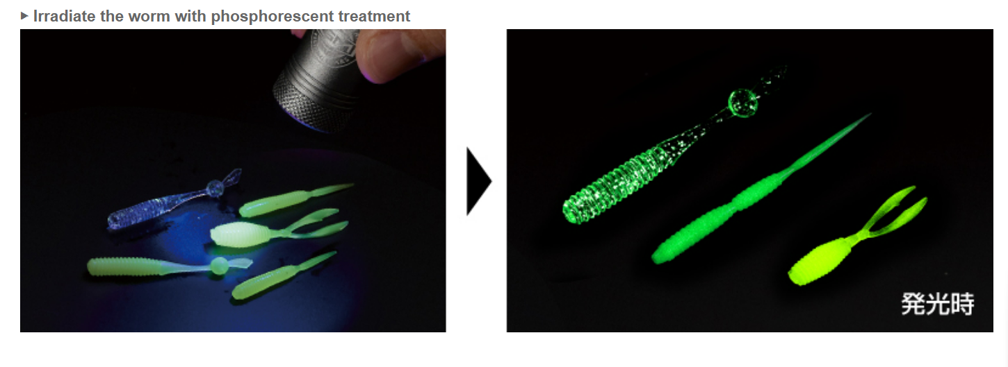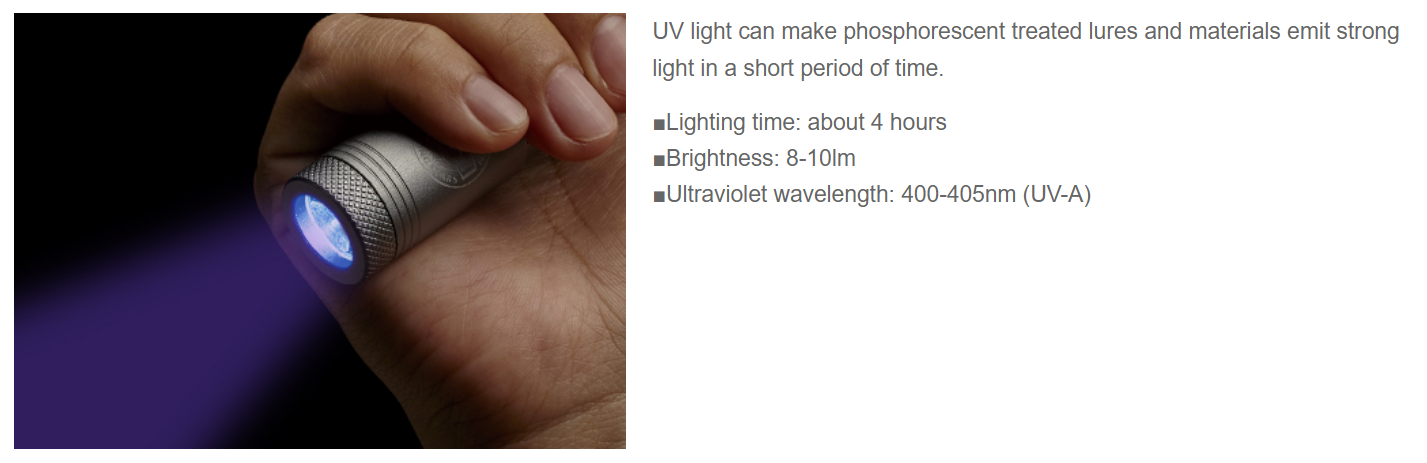 “GM UV Light” is a UV light that can strongly emit phosphorescent lures and materials in a short period of time. Equipped with a convenient LED light on the side to illuminate a dark place. A 2-way light with a carabiner that is convenient to carry.