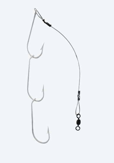 A rig consisting of a swivel and stainless steel wire trace attached to a gang of linked Mustad hooks.