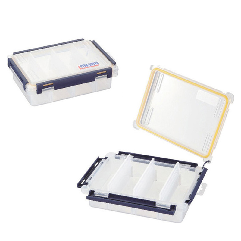 Waterproof case with three removable dividers. The lid has four large, easy-to-use fasteners and can be completely removed from the case, while being held by a silicone rivet. It has silicone around its perimeter that prevents water from penetrating inside.