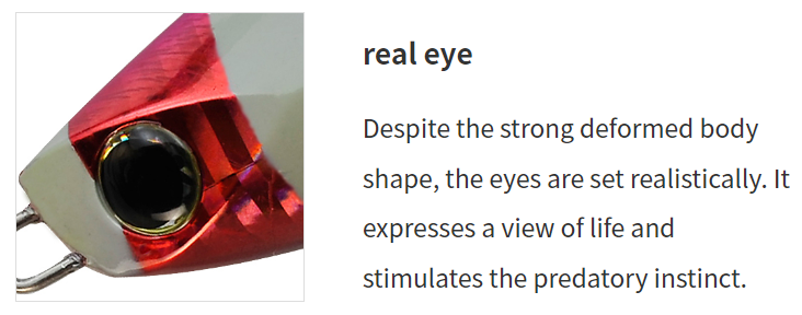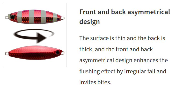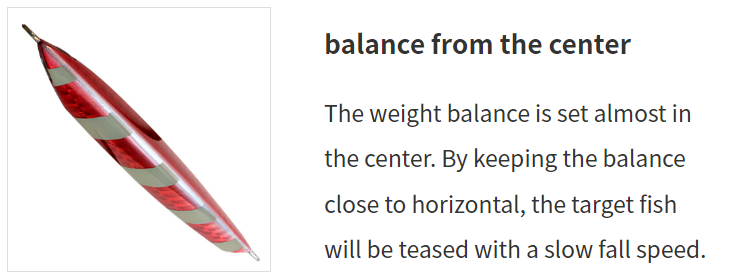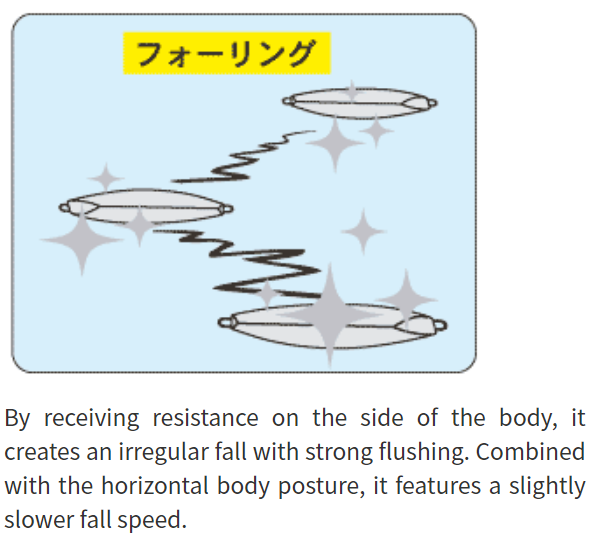 The aim of this model is to create a horizontal posture reliably even with extremely short travel distances. In addition, it is to take as long as possible the time to show the body in the horizontal direction to the target. Therefore, the weight balance pursues the limit where tailing does not occur. As a result, a body with balance almost centered was completed. By taking a horizontal posture when falling, it becomes a slightly slower speed and appeals to the target carefully. A major feature is the flushing by irregular fall that interweaves the thick and thin sides of the body.