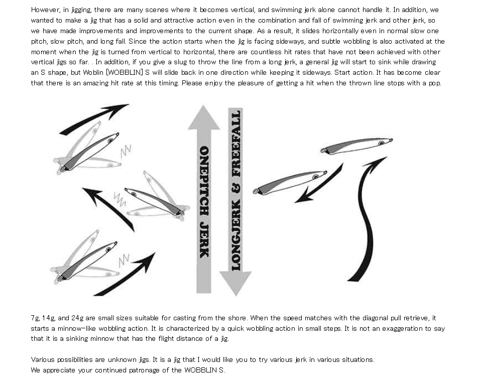 Of course, even with normal slow one pitch, slow pitch, long fall, etc., it slides horizontally short, and the wobbling wave that occurs at the time of its initial movement amplifies the appeal power, attracting various fish species such as root fish, blue fish, hairtail, and red sea bream. It is a metal jig with a new concept that finds new possibilities that are unparalleled.